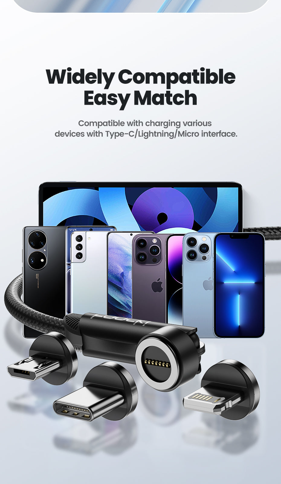 Seul câble avec rotation 540° + connexion magnétique automatique + charge rapide 3A garantie